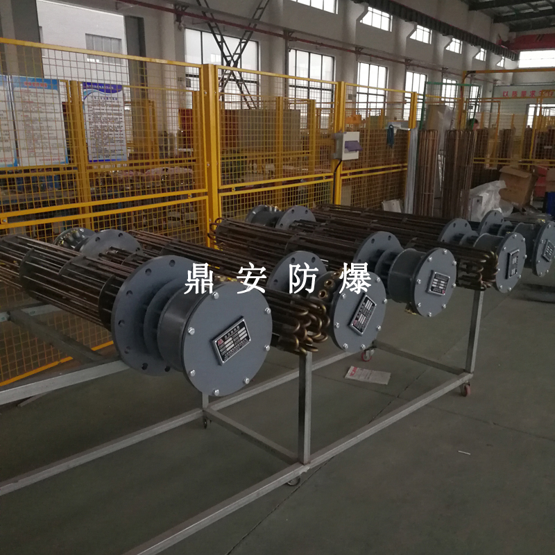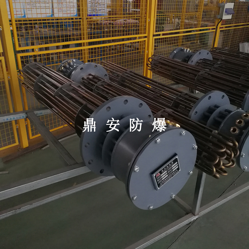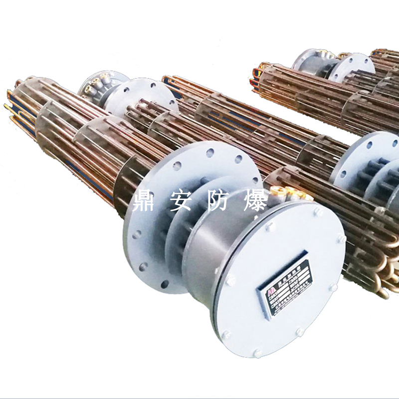 防爆法蘭電加熱管(也稱插入式電加熱器):是采用U型管狀電熱元件,依據(jù)加熱不同介質設計規(guī)范,按照功率配置要求裝配在法蘭蓋上,插入需加熱物料中,發(fā)熱元件工作時所發(fā)出的大量熱量傳導給被加熱介質使介質溫度升高,達到所需的工藝要求。當介質溫度達到工藝要求的設定值時,控制系統(tǒng)根據(jù)溫度傳感器信號,經(jīng)PID 運算后調節(jié)電加熱器輸出功率,對發(fā)熱元件的電阻性負載實現(xiàn)溫度控制。使介質溫度均勻,達到所需要求;當發(fā)熱元件超溫或低液位時,發(fā)熱元件的聯(lián)鎖保護裝置立即切斷加熱電源避免發(fā)熱元件燒壞,延長使用壽命。