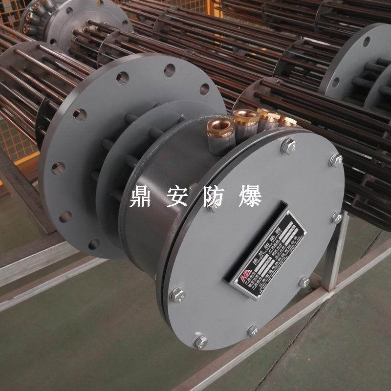 防爆法蘭加熱管是由多支加熱管焊接在法蘭上集中加熱。主要用于敞開式、封閉式的溶液箱和循環(huán)系統(tǒng)中加熱用。優(yōu)點: 表面功率大,使一般電加熱表面負荷的2~4倍,高度密集式、結構緊湊。由于整體短而密集,故穩(wěn)定性好,安裝無需支架。組合式法蘭加熱管大多采用氬弧焊接方式使電熱管于法蘭連接,也可利用緊固裝置的形式,即每支電熱管上焊由緊固件。然后與法蘭蓋采用螺母鎖緊。管子于緊固件采用氬弧焊接。緊固件密封處采用科學的工藝。單支更換方便,大大節(jié)約以后的維修成本選擇進口及國內優(yōu)質材料。科學的生產(chǎn)工藝,嚴格的質量管理,保證電熱管優(yōu)越的電氣性能。