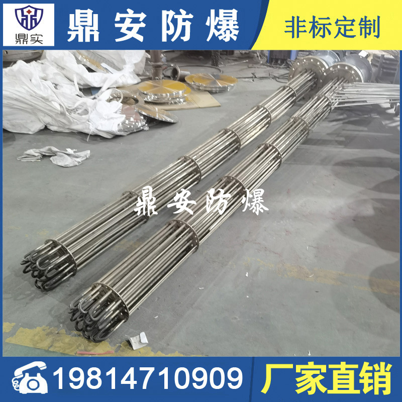 防爆法蘭加熱管是由多支加熱管焊接在法蘭上集中加熱。主要用于敞開式、封閉式的溶液箱和循環(huán)系統(tǒng)中加熱用。優(yōu)點(diǎn): 表面功率大,使一般電加熱表面負(fù)荷的2~4倍,高度密集式、結(jié)構(gòu)緊湊。由于整體短而密集,故穩(wěn)定性好,安裝無需支架。組合式法蘭加熱管大多采用氬弧焊接方式使電熱管于法蘭連接,也可利用緊固裝置的形式,即每支電熱管上焊由緊固件。然后與法蘭蓋采用螺母鎖緊。管子于緊固件采用氬弧焊接。緊固件密封處采用科學(xué)的工藝。單支更換方便,大大節(jié)約以后的維修成本選擇進(jìn)口及國內(nèi)優(yōu)質(zhì)材料。科學(xué)的生產(chǎn)工藝,嚴(yán)格的質(zhì)量管理,保證電熱管優(yōu)越的電氣性能。