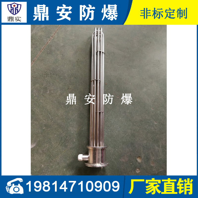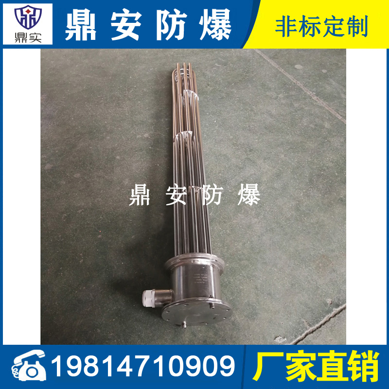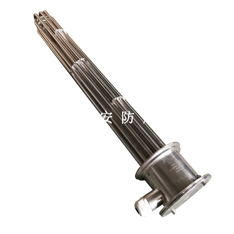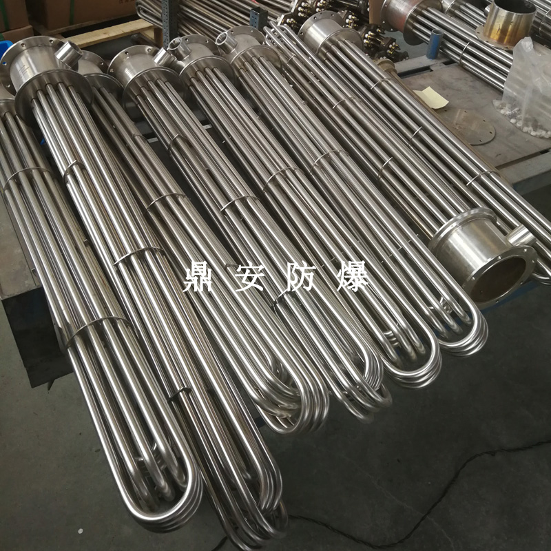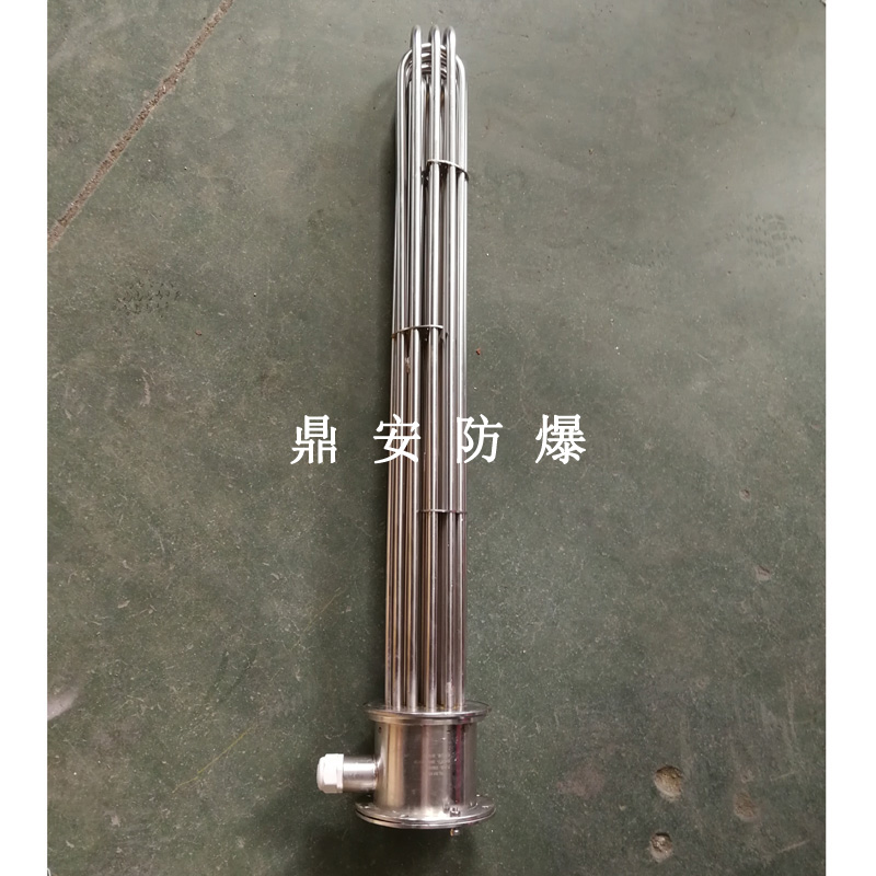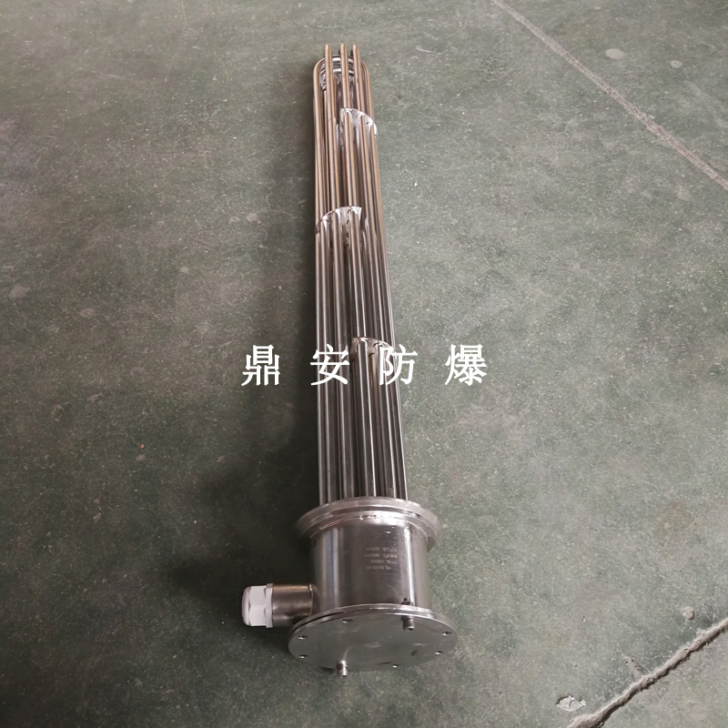 法蘭電熱管(也稱插入式電加熱器):是采用U型管狀電熱元件,多支U型電熱管焊接在法蘭上集中加熱,依據(jù)加熱不同介質(zhì)設(shè)計(jì)規(guī)范,按照功率配置要求裝配在法蘭蓋上,插入需加熱物料中,發(fā)熱元件工作時(shí)所發(fā)出的大量熱量傳導(dǎo)給被加熱介質(zhì)使介質(zhì)溫度升高,達(dá)到所需的工藝要求,主要用于敞開式、封閉式的溶液箱和循環(huán)系統(tǒng)中加熱用。