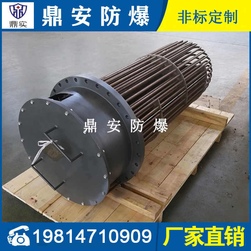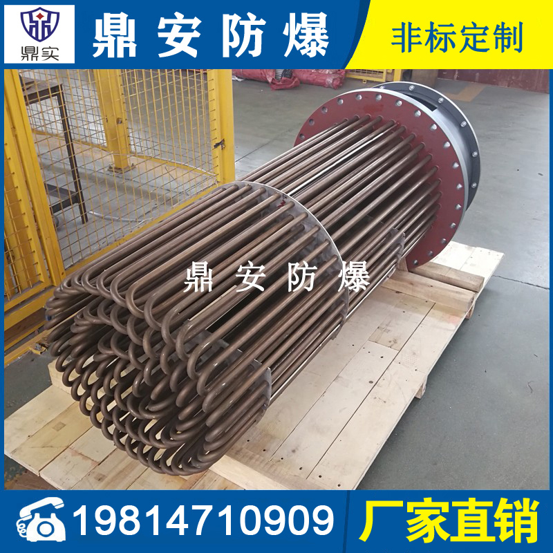法蘭電熱管(也稱插入式電加熱器):是采用U型管狀電熱元件,多支U型電熱管焊接在法蘭上集中加熱,依據(jù)加熱不同介質(zhì)設計規(guī)范,按照功率配置要求裝配在法蘭蓋上,插入需加熱物料中,發(fā)熱元件工作時所發(fā)出的大量熱量傳導給被加熱介質(zhì)使介質(zhì)溫度升高,達到所需的工藝要求,主要用于敞開式、封閉式的溶液箱和循環(huán)系統(tǒng)中加熱用。