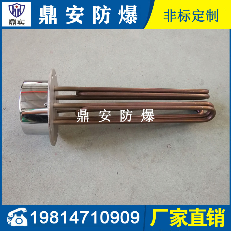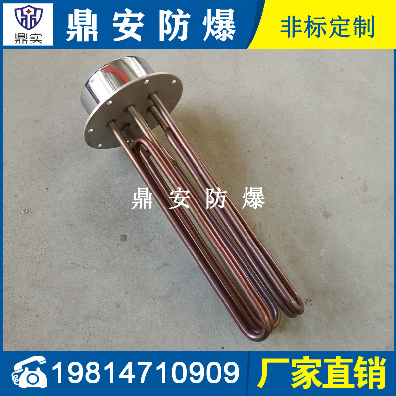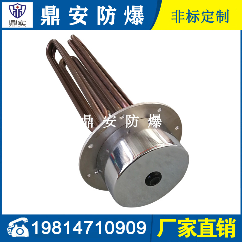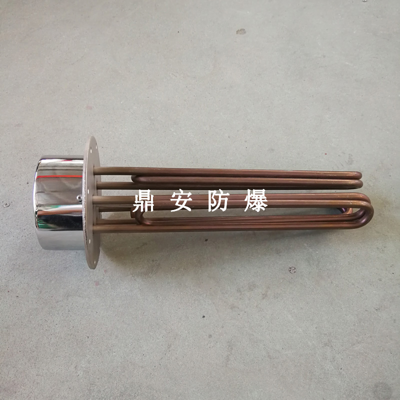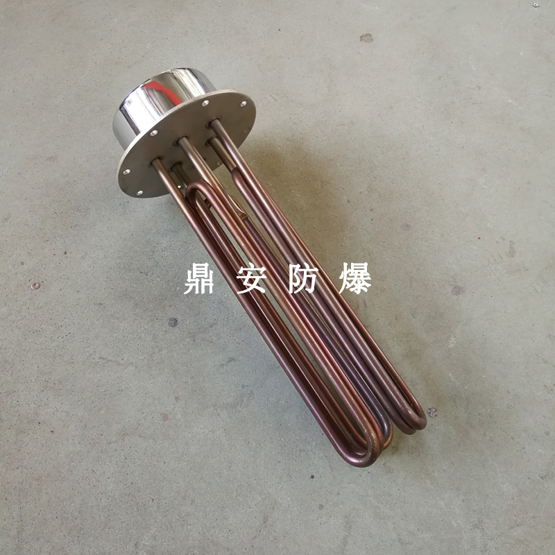法蘭電熱管(也稱插入式電加熱器):是采用U型管狀電熱元件,多支U型電熱管焊接在法蘭上集中加熱,依據(jù)加熱不同介質(zhì)設(shè)計規(guī)范,按照功率配置要求裝配在法蘭蓋上,插入需加熱物料中,發(fā)熱元件工作時所發(fā)出的大量熱量傳導(dǎo)給被加熱介質(zhì)使介質(zhì)溫度升高,達(dá)到所需的工藝要求,主要用于敞開式、封閉式的溶液箱和循環(huán)系統(tǒng)中加熱用。