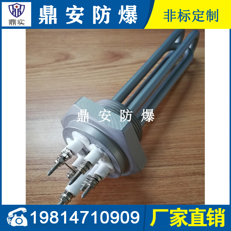 法蘭電熱管(也稱插入式電加熱器):是采用U型管狀電熱元件,多支U型電熱管焊接在法蘭上集中加熱,依據(jù)加熱不同介質(zhì)設(shè)計(jì)規(guī)范,按照功率配置要求裝配在法蘭蓋上,插入需加熱物料中,發(fā)熱元件工作時(shí)所發(fā)出的大量熱量傳導(dǎo)給被加熱介質(zhì)使介質(zhì)溫度升高,達(dá)到所需的工藝要求,主要用于敞開(kāi)式、封閉式的溶液箱和循環(huán)系統(tǒng)中加熱用。