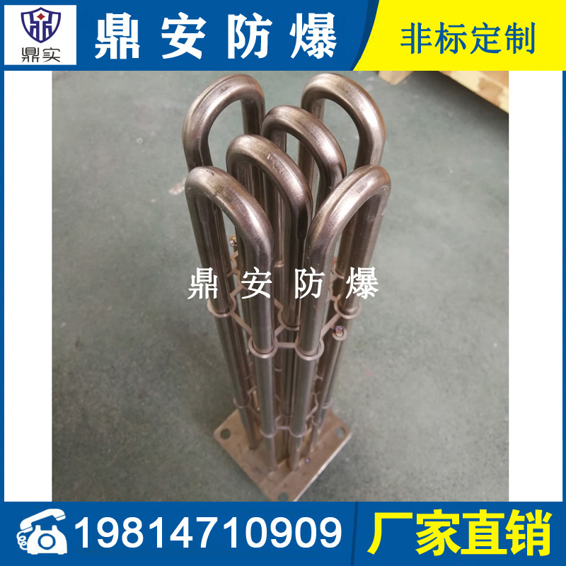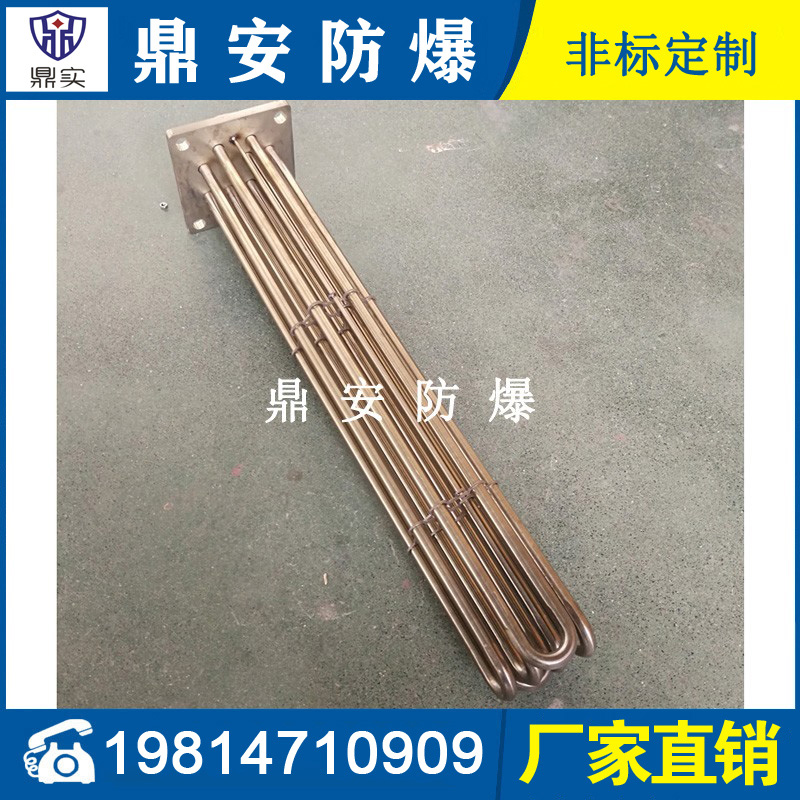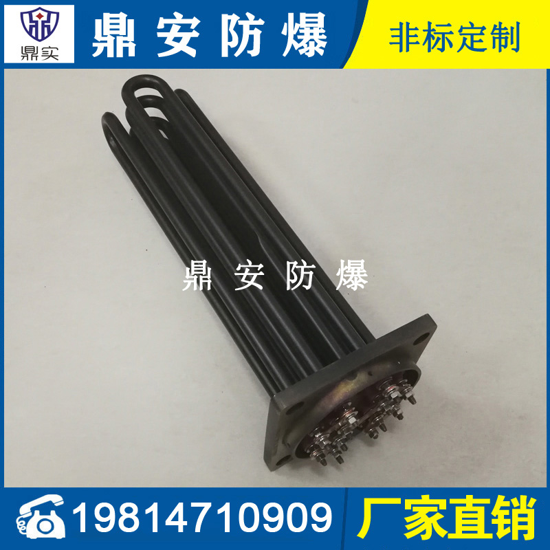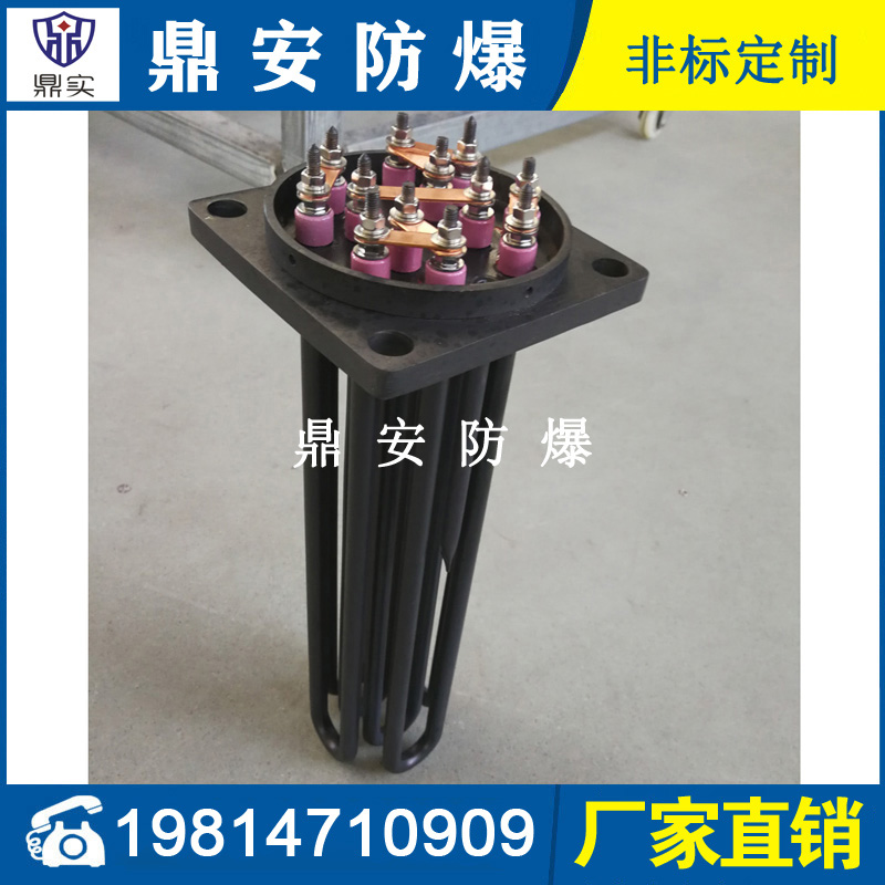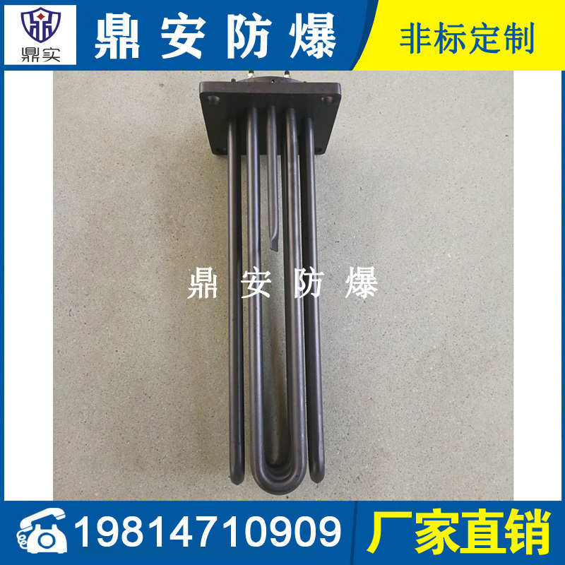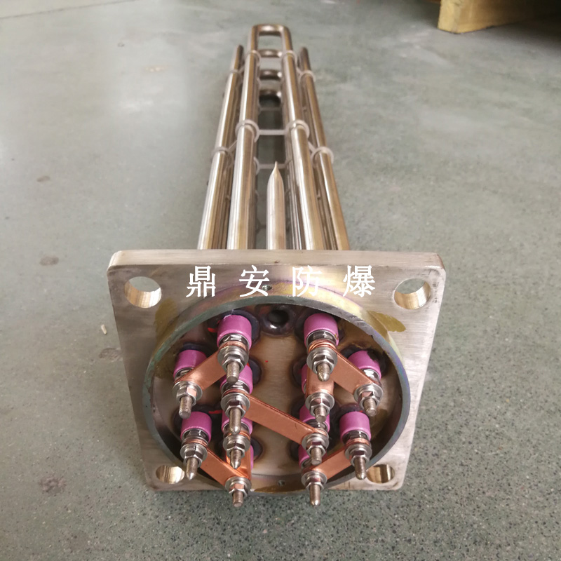 法蘭電熱管(也稱(chēng)插入式電加熱器):是采用U型管狀電熱元件,多支U型電熱管焊接在法蘭上集中加熱,依據(jù)加熱不同介質(zhì)設(shè)計(jì)規(guī)范,按照功率配置要求裝配在法蘭蓋上,插入需加熱物料中,發(fā)熱元件工作時(shí)所發(fā)出的大量熱量傳導(dǎo)給被加熱介質(zhì)使介質(zhì)溫度升高,達(dá)到所需的工藝要求,主要用于敞開(kāi)式、封閉式的溶液箱和循環(huán)系統(tǒng)中加熱用。